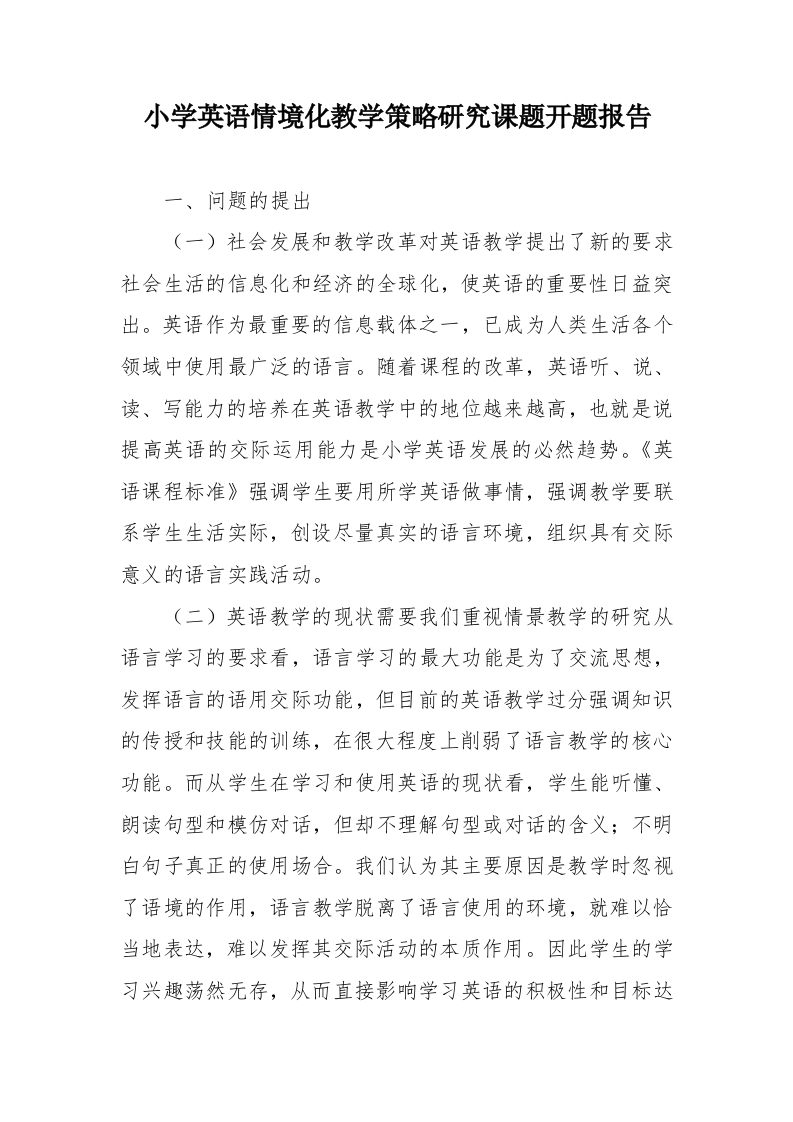 小学英语情境化教学策略研究课题开题报告