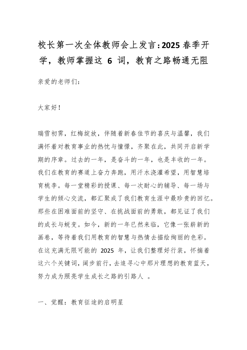 首页校长资料工作讲话校长第一次全体教师会上发言:2025春季开学,教师掌握这 6 词,教育之路畅通无阻