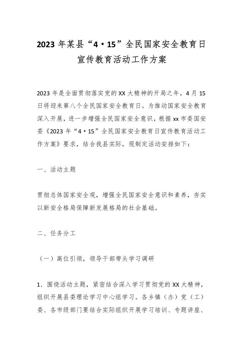 2023年某县“4·15”全民国家安全教育日宣传教育活动工作方案