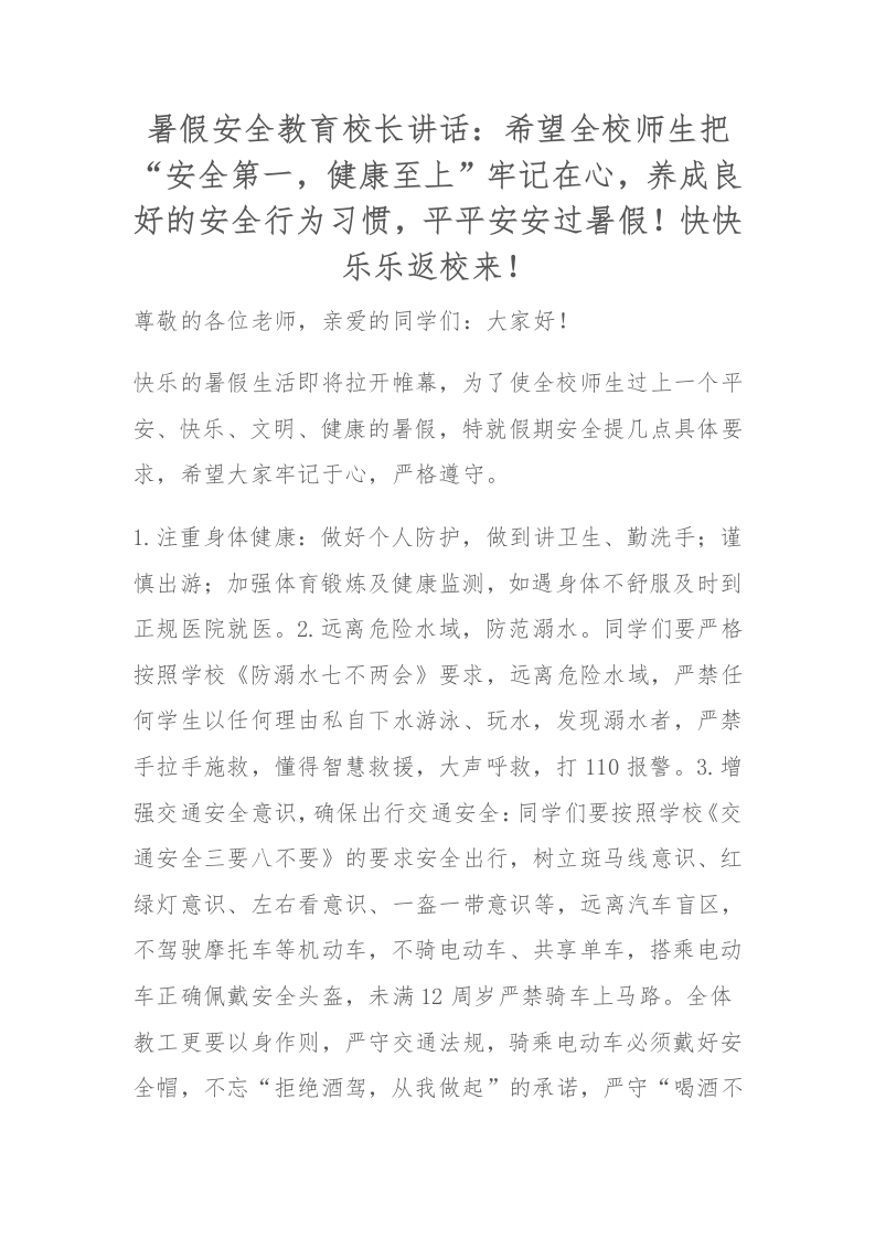 首页安全资料校园安全暑假安全教育校长讲话:希望全校师生把“安全第一,健康至上”牢记在心,养成良好的安全行为习惯,平平安安过暑假!快快乐乐返校来!