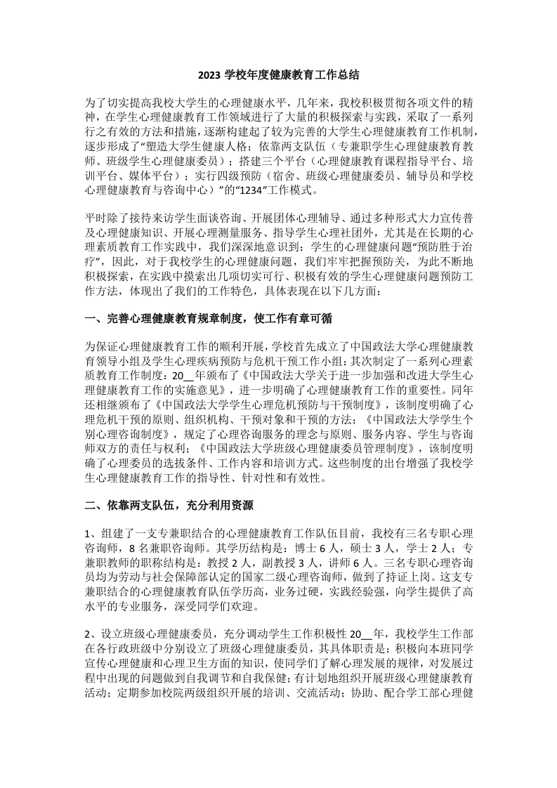 首页安全资料计划总结 8.2023学校年度健康教育工作总结
