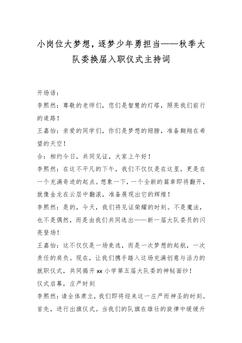 首页综合资料其它资料小岗位大梦想,逐梦少年勇担当——秋季大队委换届入职仪式主持词