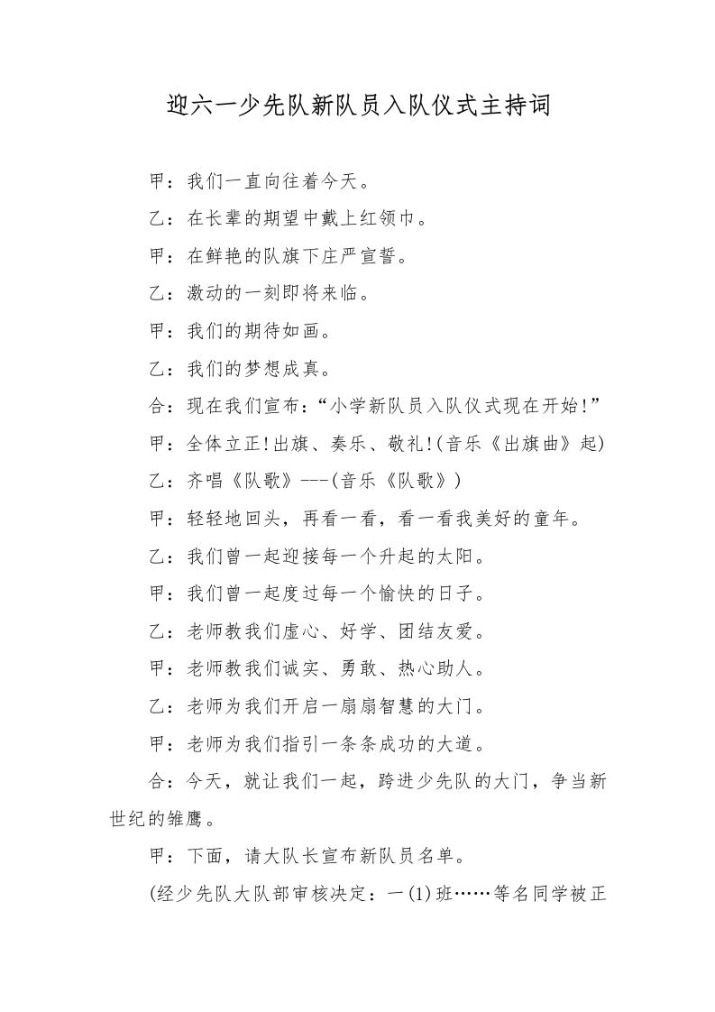 迎六一少先队新队员入队仪式主持词