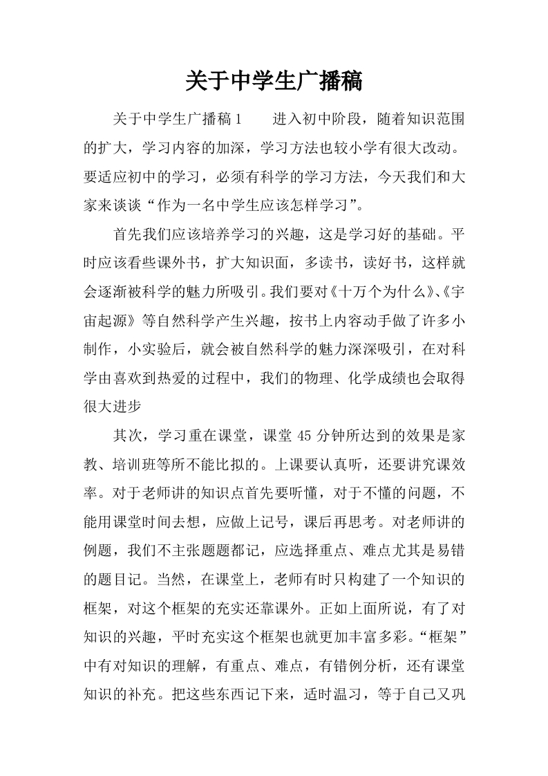 [范本]关于中学生广播稿
