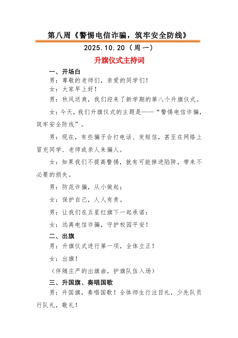 2025-2026秋季第一学期中小学升旗仪式22周主持词:第8周 警惕电信诈骗,筑牢安全防线