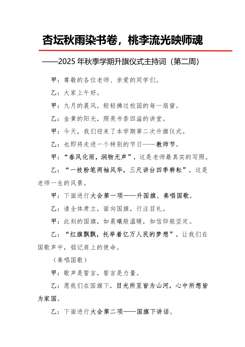 2025年秋季第一学期升旗仪式主持词(21周):第2周 杏坛秋雨染书卷,桃李流光映师魂