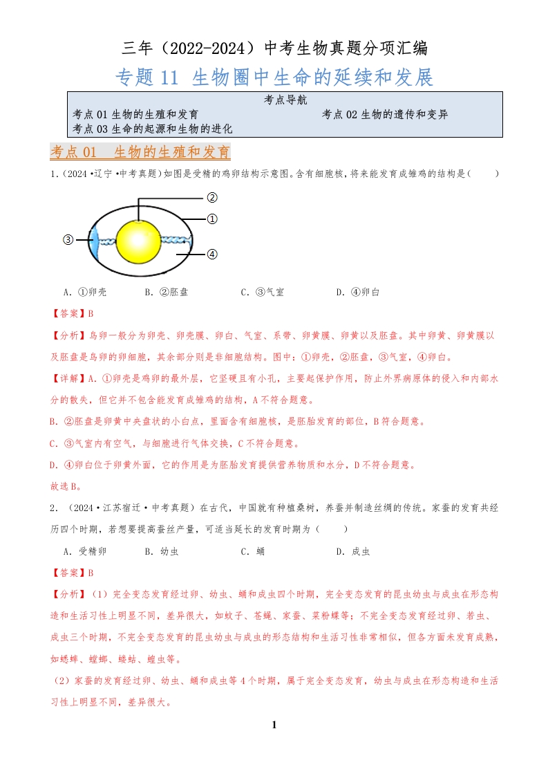 2022-2024中考生物真题分类汇编(全国通用)专题11 生物圈中生命的延续和发展(解析版)