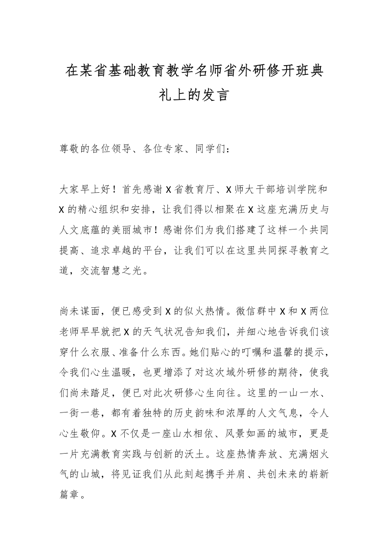在某省基础教育教学名师省外研修开班典礼上的发言