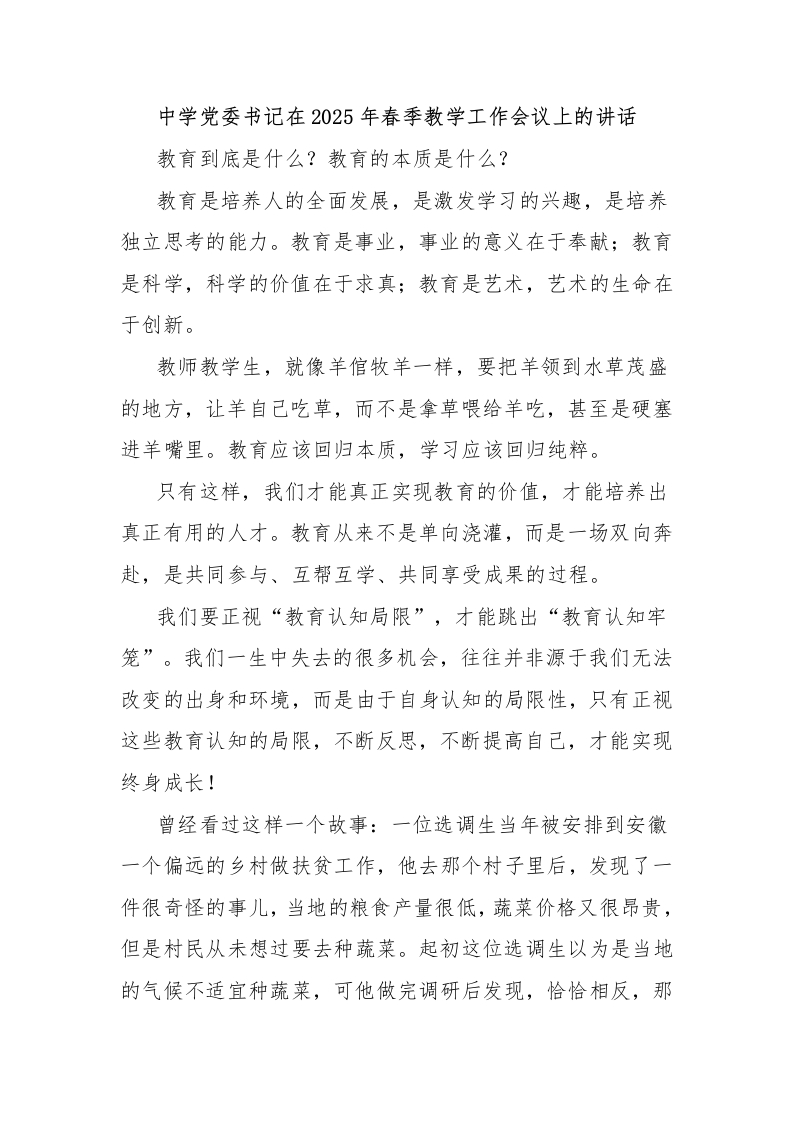 首页班主任库发言讲话中学党委书记在2025年春季教学工作会议上的讲话