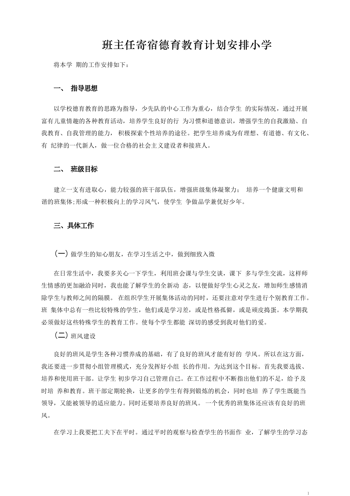 小学寄宿学校班主任德育教育计划安排