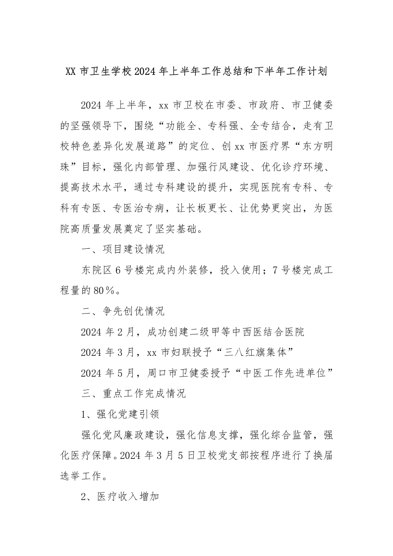 XX市卫生学校2024年上半年工作总结和下半年工作计划