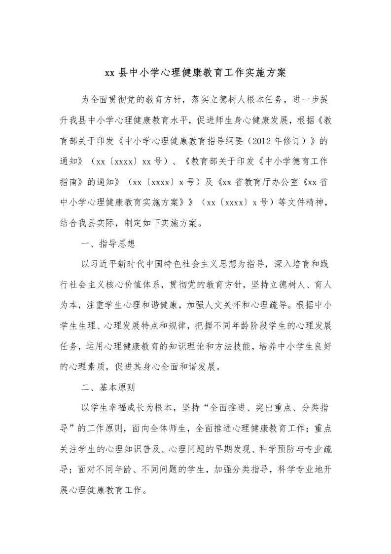 XX县中小学心理健康教育工作实施方案