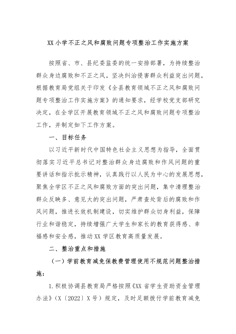 XX小学不正之风和腐败问题专项整治工作实施方案