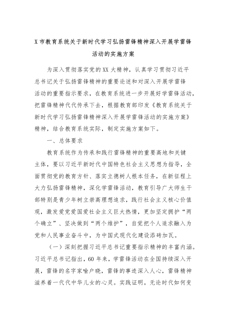 X市教育系统关于新时代学习弘扬雷锋精神深入开展学雷锋活动的实施方案