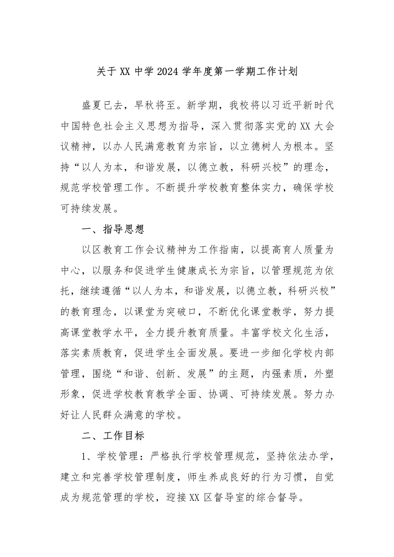 关于XX中学2024学年度第一学期工作计划