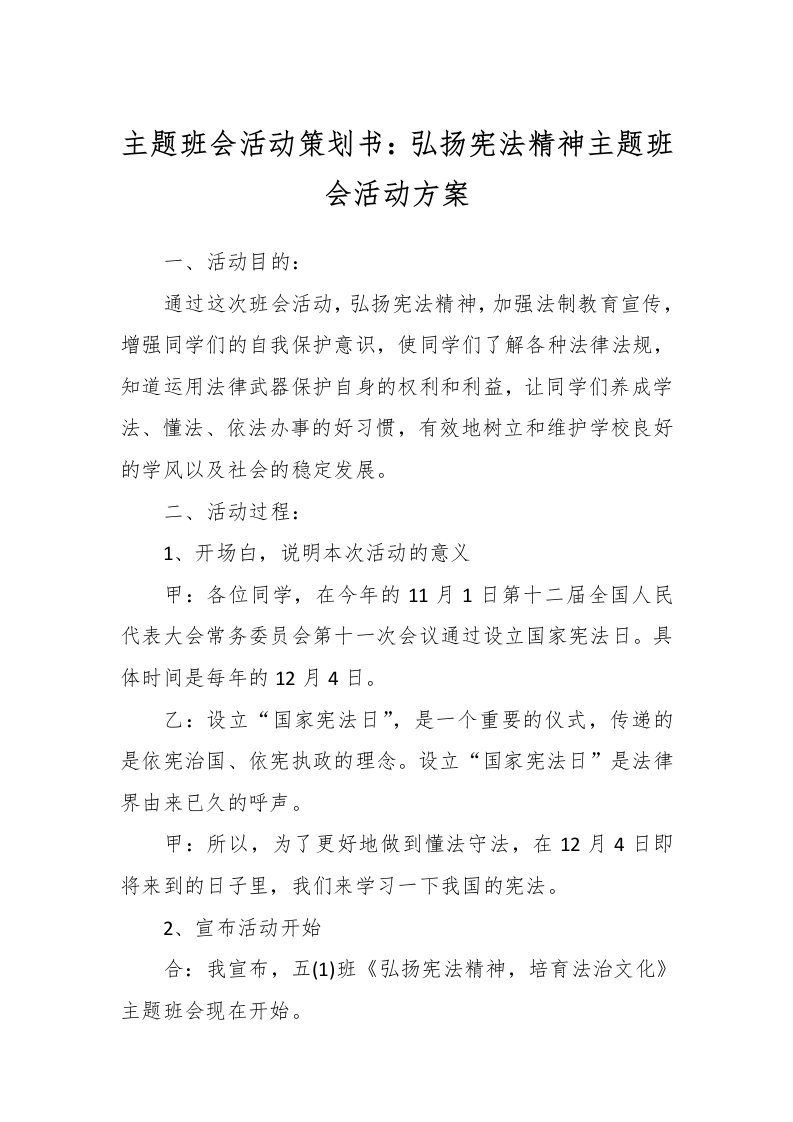 主题班会活动策划书:弘扬宪法精神主题班会活动方案