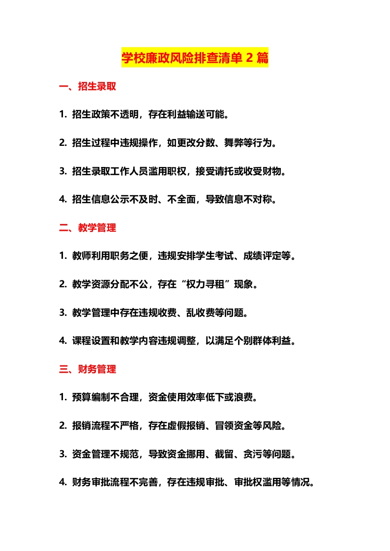 首页党建资料 党风廉政学校廉政风险排查清单2篇