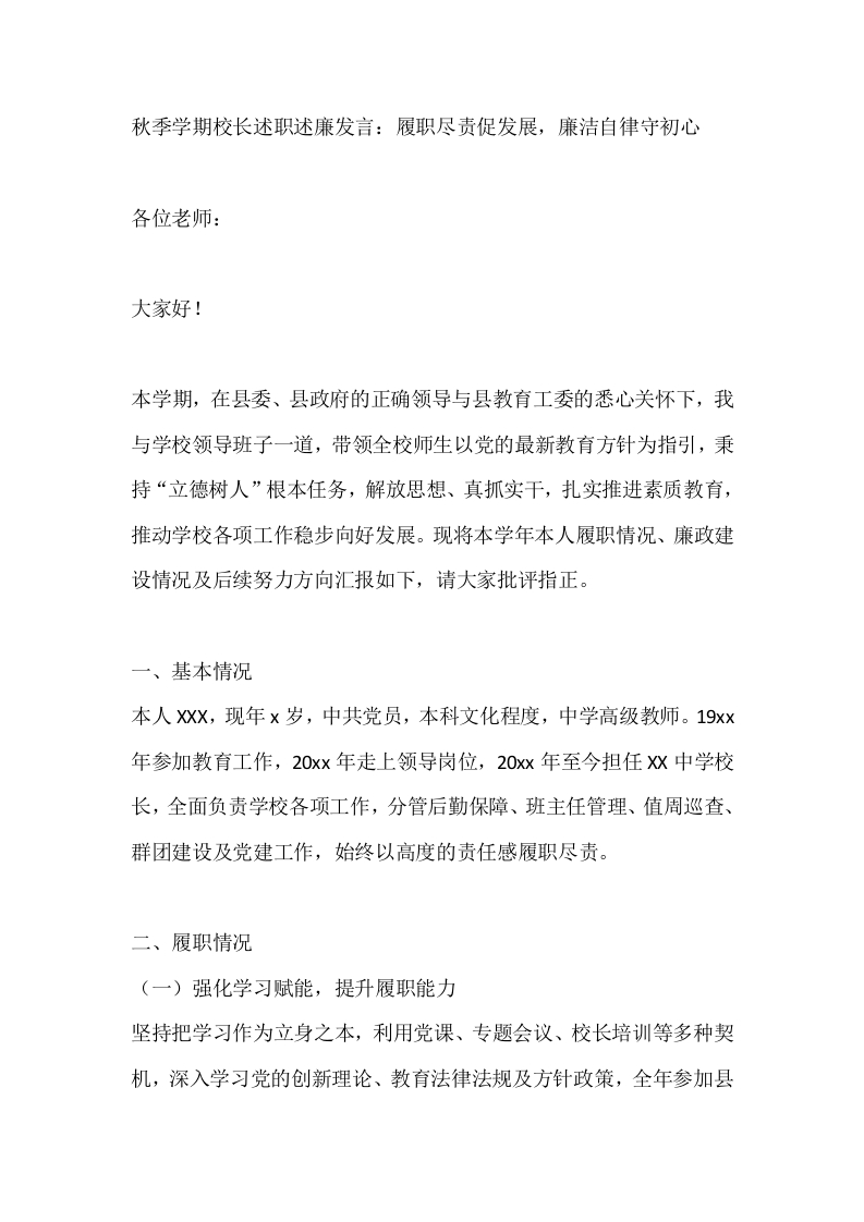 首页热门资源演讲讲话秋季学期校长述职述廉发言:履职尽责促发展,廉洁自律守初心