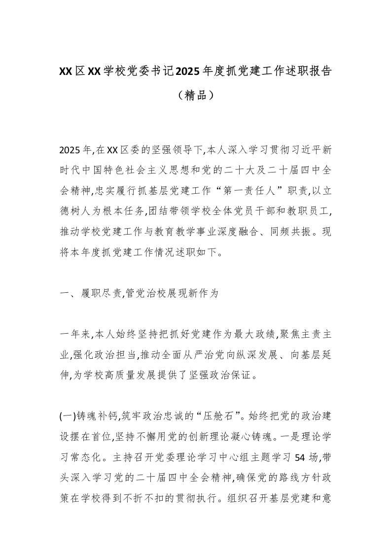 XX区XX学校党委书记2025年度抓党建工作述职报告(精品)