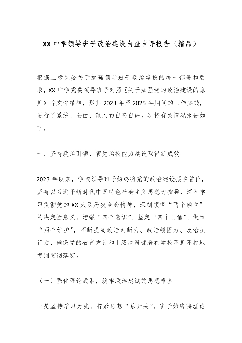 首页学校教务计划总结XX中学领导班子政治建设自查自评报告(精品)