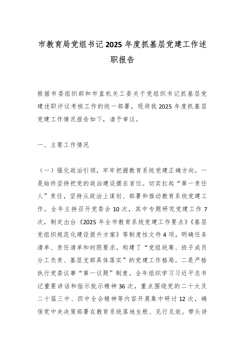 首页校长资料汇报演讲市教育局党组书记2025年度抓基层党建工作述职报告