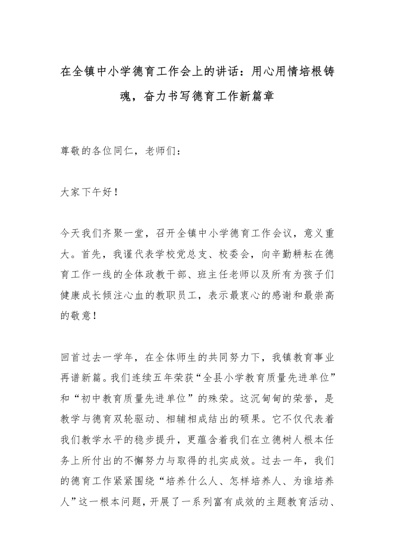 在全镇中小学德育工作会上的讲话:用心用情培根铸魂,奋力书写德育工作新篇章