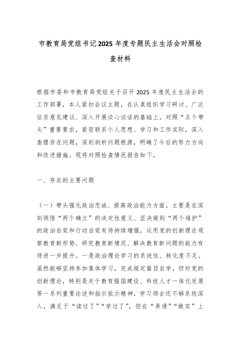 首页党建资料党课党建市教育局党组书记2025年度专题民主生活会对照检查材料