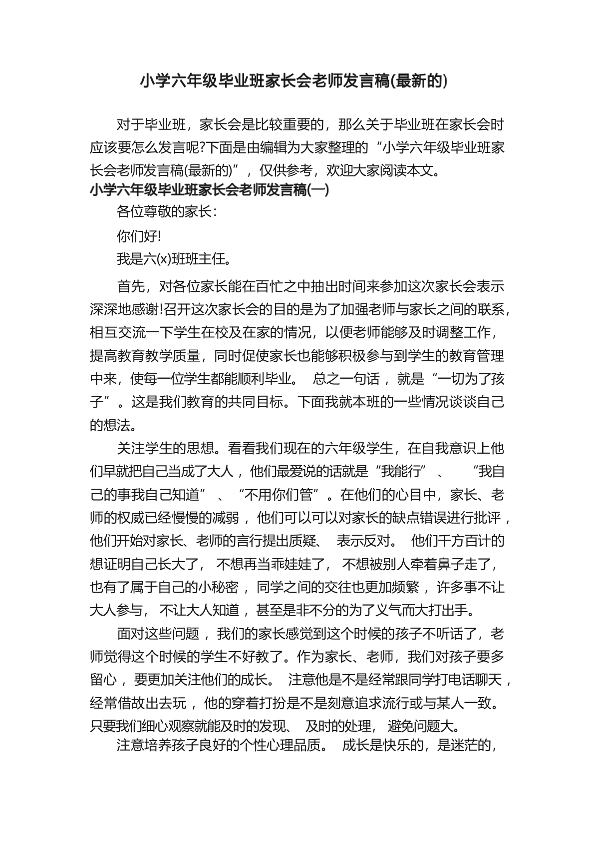 小学六年级毕业班家长会老师发言稿(最新的)