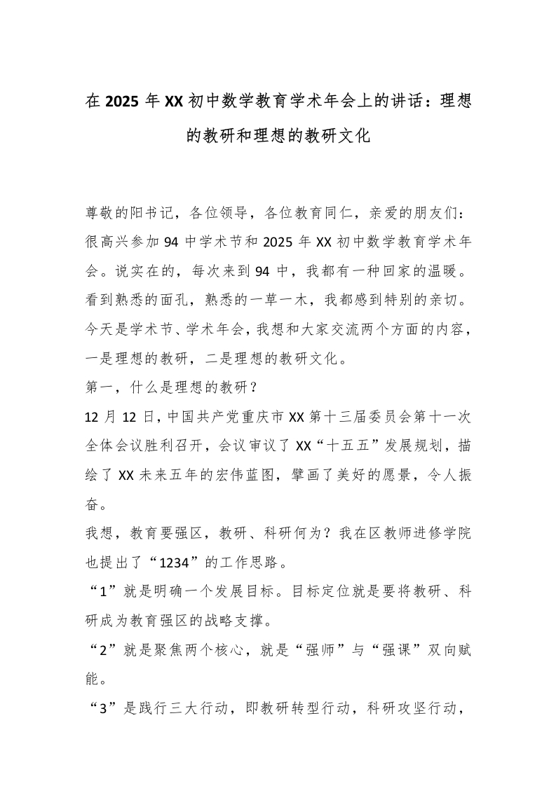 在2025年XXX初中数学教育学术年会上的讲话:理想的教研和理想的教研文化