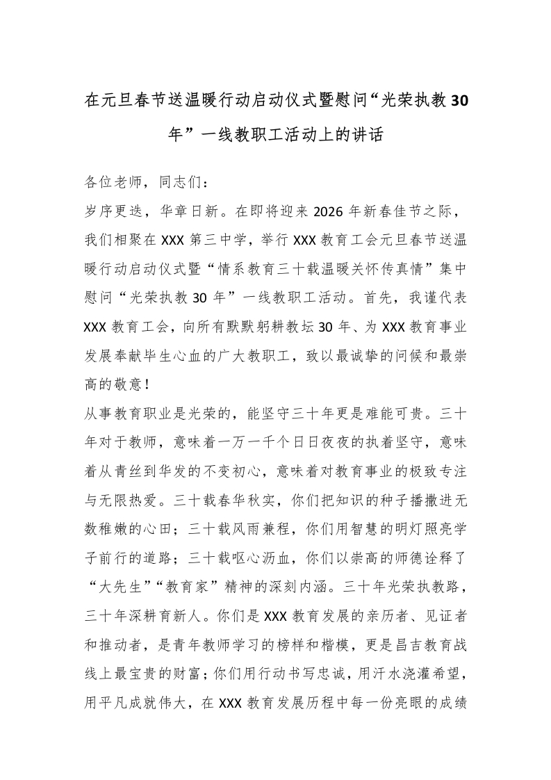 在元旦春节送温暖行动启动仪式暨慰问“光荣执教30年”一线教职工活动上的讲话