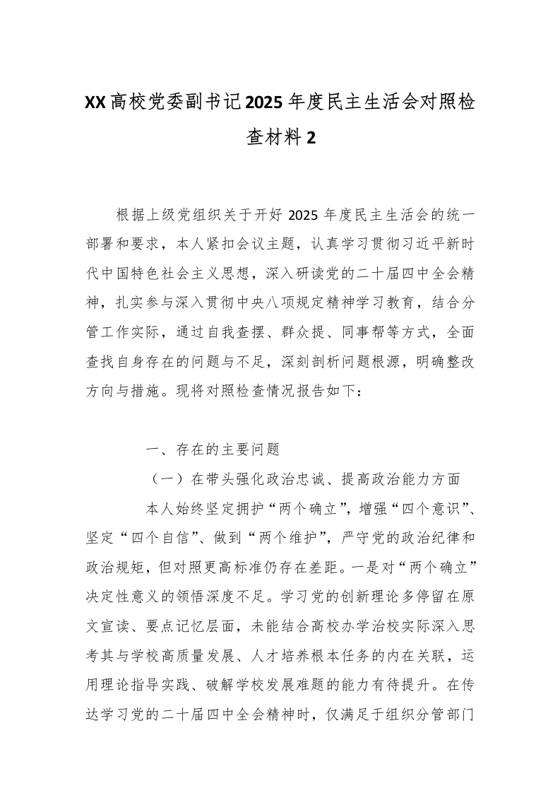 首页党建资料党课党建XX高校党委副书记2025年度民主生活会对照检查材料2