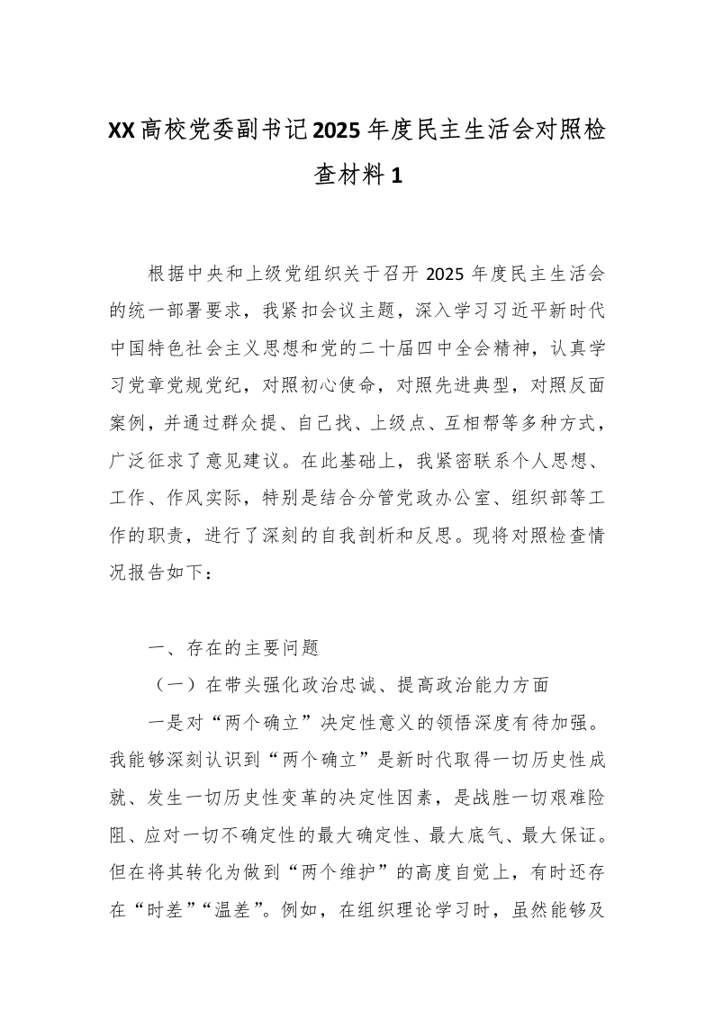 XX高校党委副书记2025年度民主生活会对照检查材料1