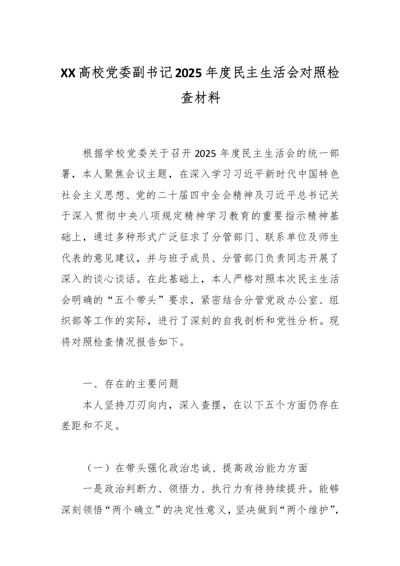 XX高校党委副书记2025年度民主生活会对照检查材料