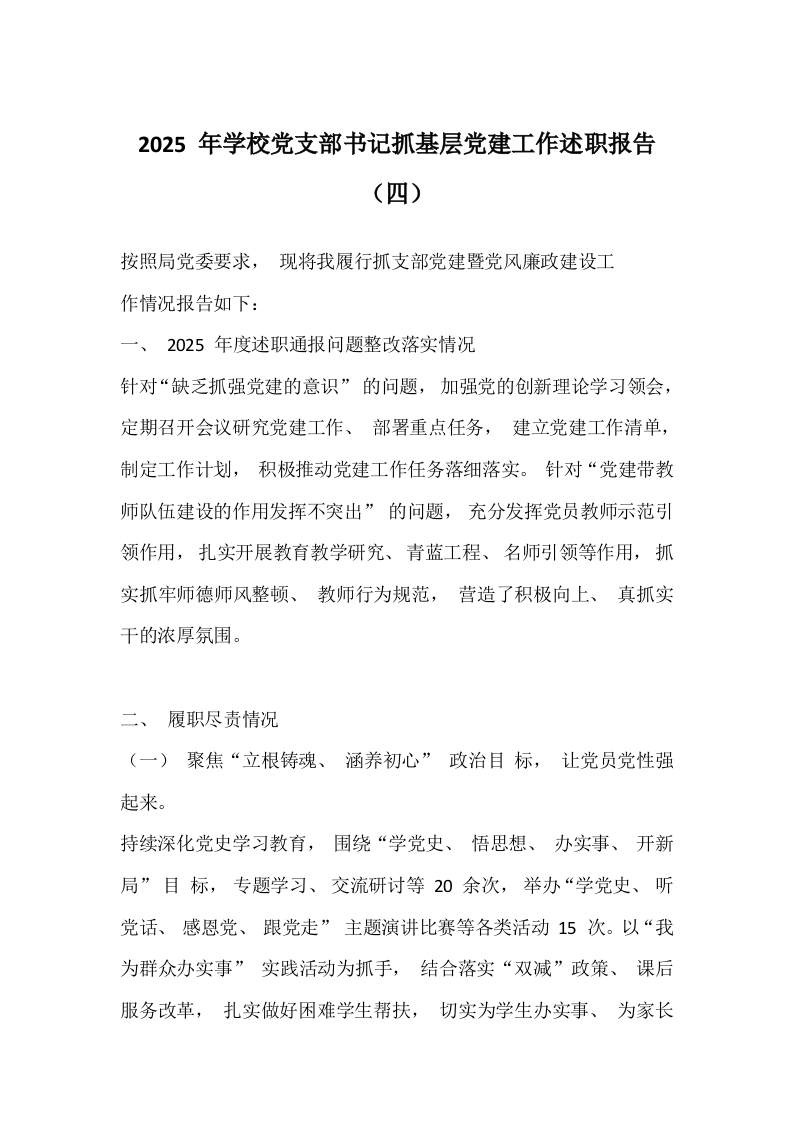 2025 年学校党支部书记抓基层党建工作述职报告(四)