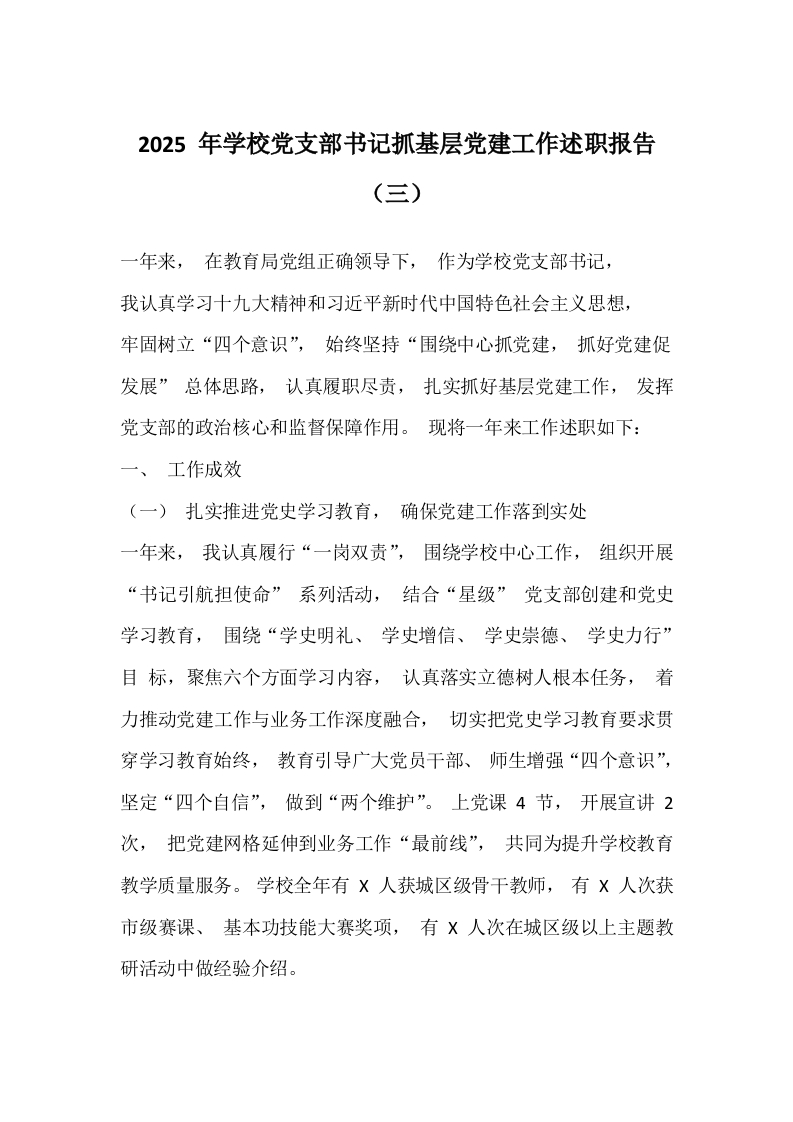 2025 年学校党支部书记抓基层党建工作述职报告(三)