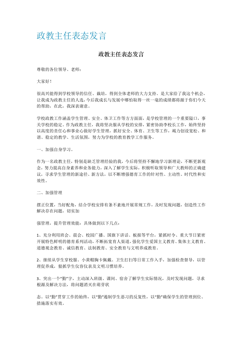 政教主任表态发言