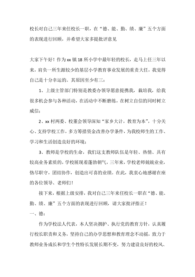 校长对自己三年来任校长一职,在“德、能、勤、绩、廉”五个方面的表现进行回顾,并希望大家多提批评意见