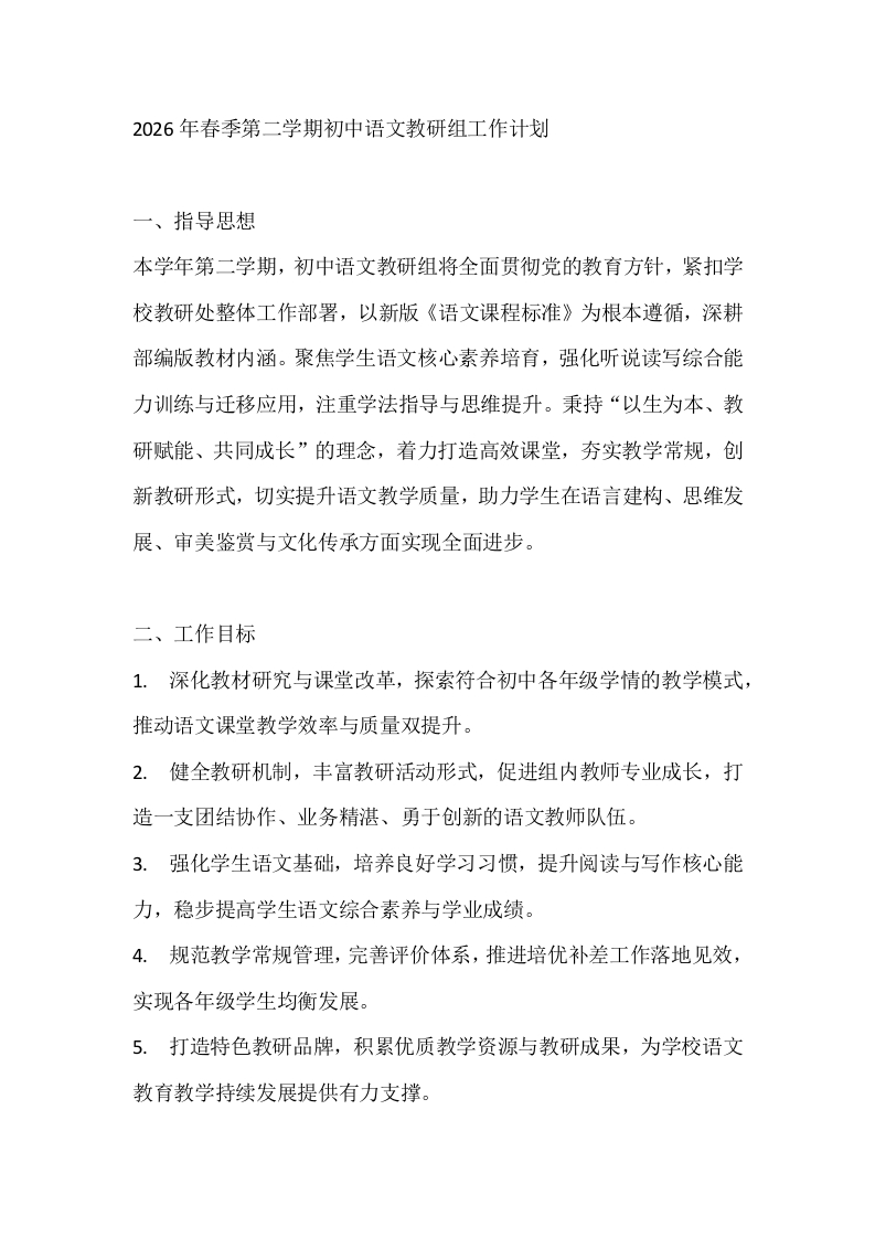 2026年春季第二学期初中语文教研组工作计划