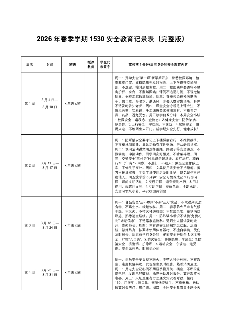 首页安全资料安全表格2026 年春季学期 1530 安全教育记录表