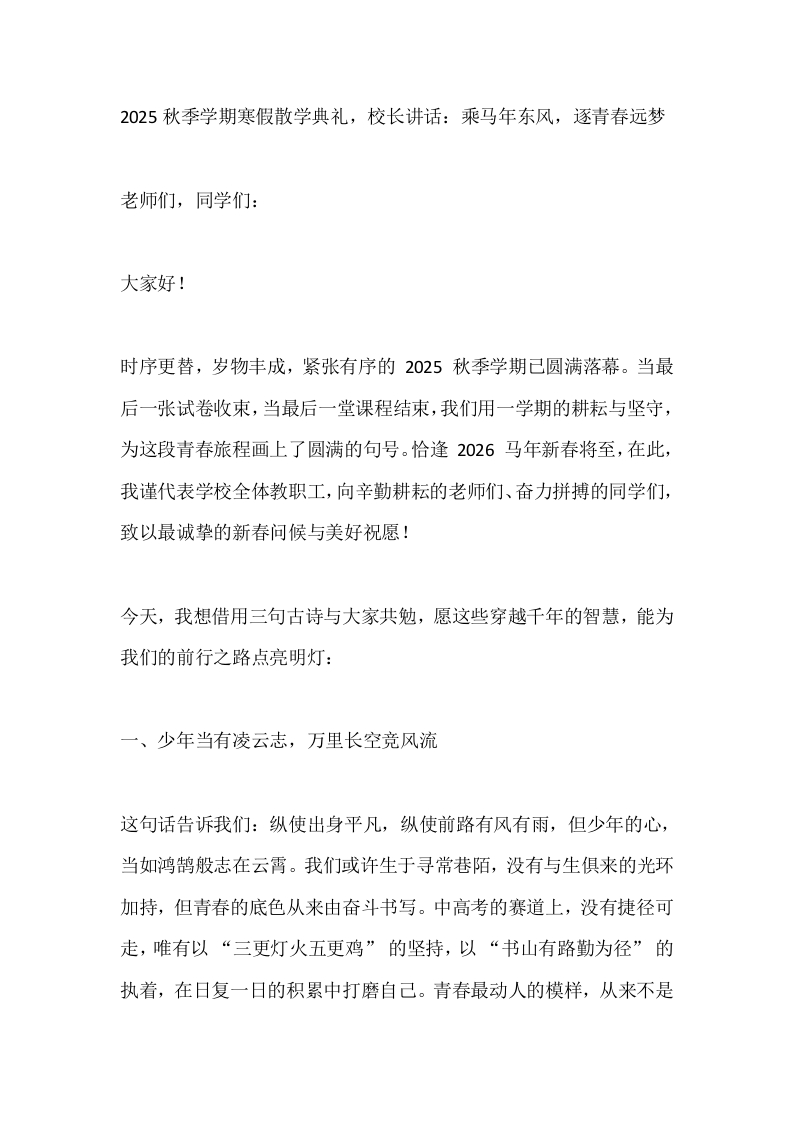 2025秋季学期寒假散学典礼,校长讲话:乘马年东风,逐青春远梦
