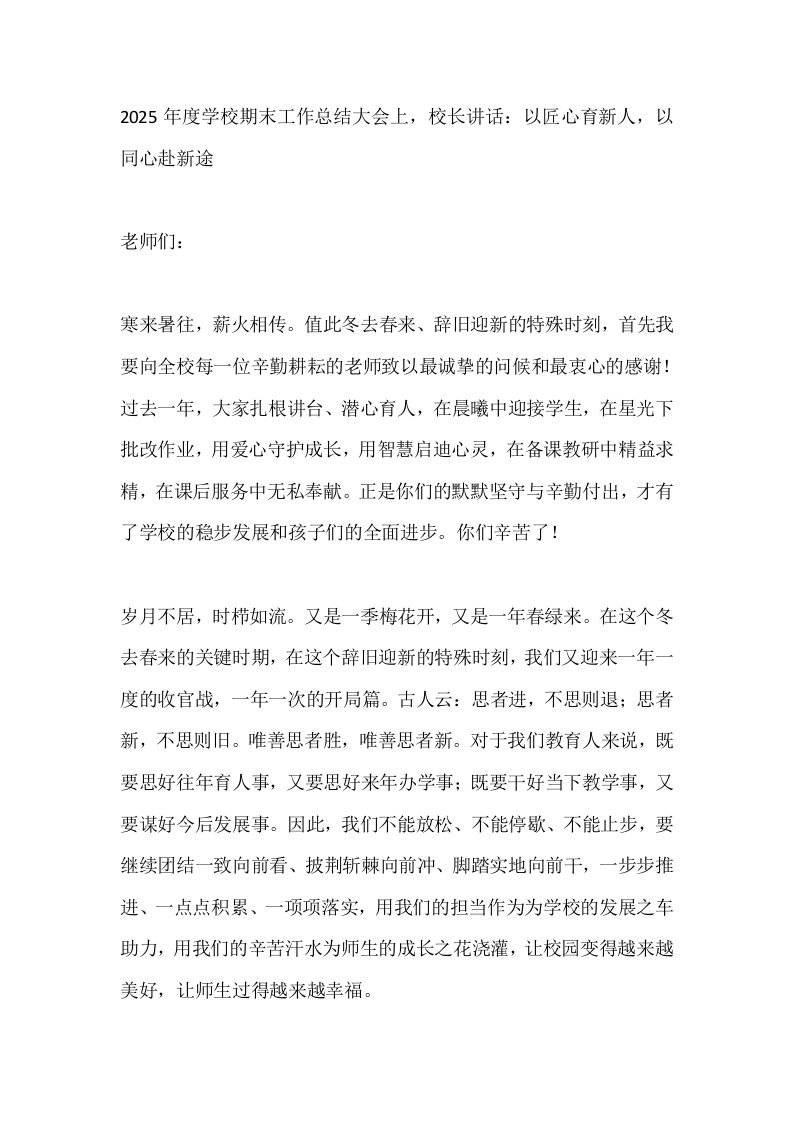 首页校长资料报告总结2025年度学校期末工作总结大会上,校长讲话:以匠心育新人,以同心赴新途