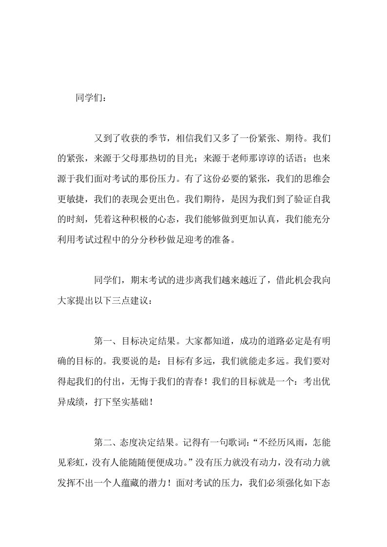 临近期末考试,校长讲话大考在即,箭在弦上,请拿出你们的智慧和勇气,从现在起,做好精心准备,去迎接即将到来的期末考试。
