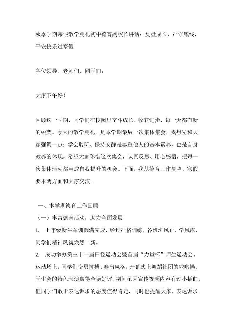 秋季学期寒假散学典礼初中德育副校长讲话:复盘成长、严守底线,平安快乐过寒假