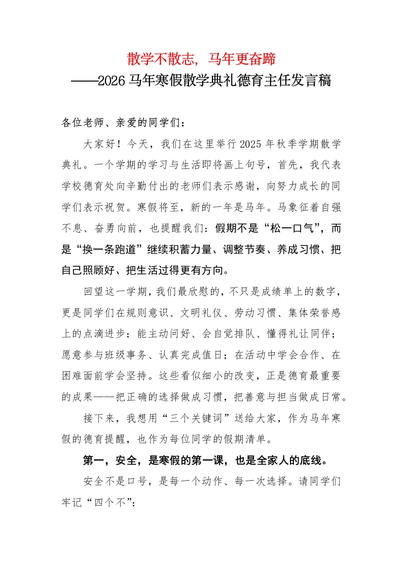 散学不散志,马年更奋蹄——2026马年寒假散学典礼德育主任发言稿