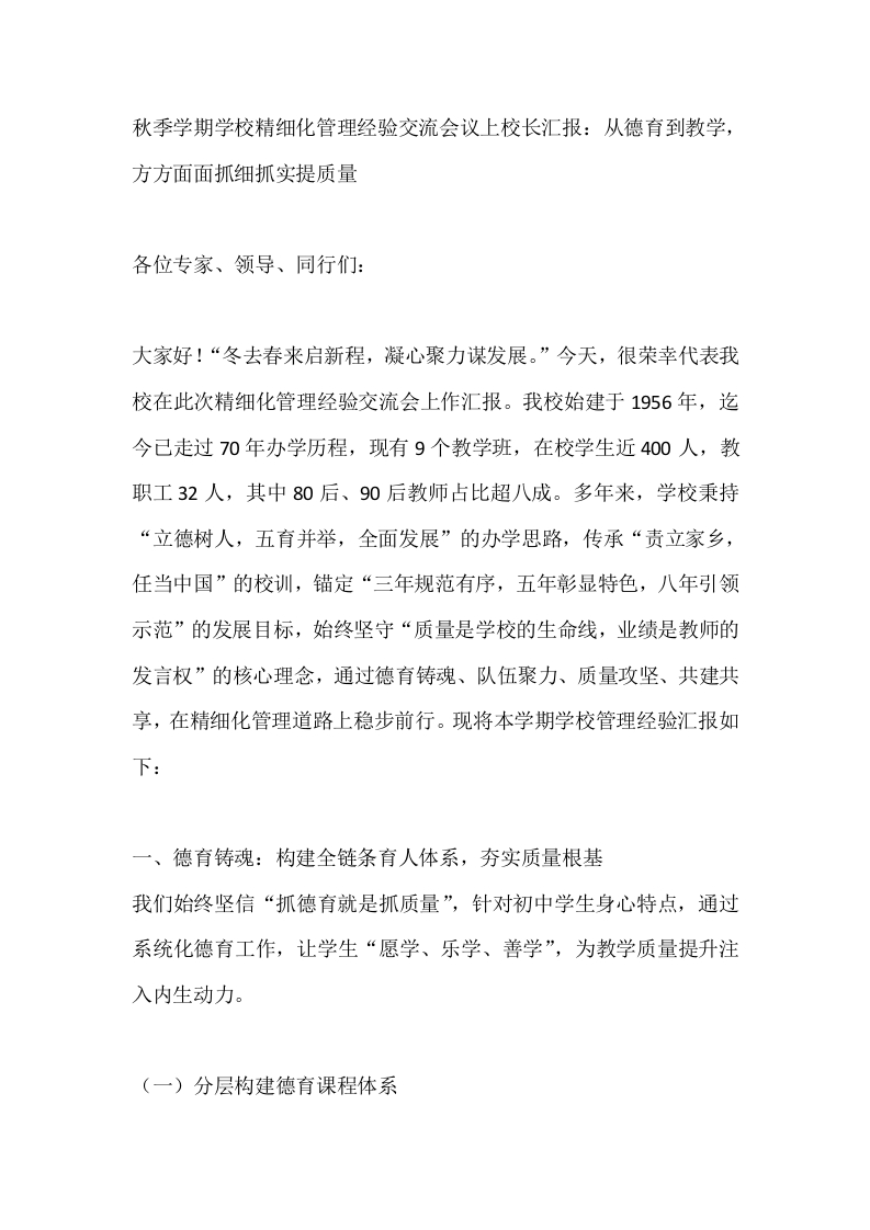 秋季学期学校精细化管理经验交流会议上校长汇报:从德育到教学,方方面面抓细抓实提质量