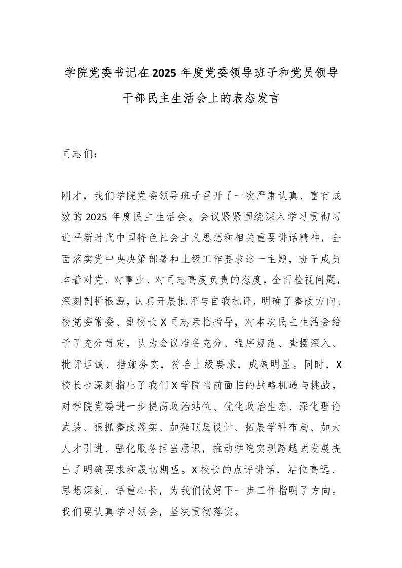 学院党委书记在2025年度党委领导班子和党员领导干部民主生活会上的表态发言