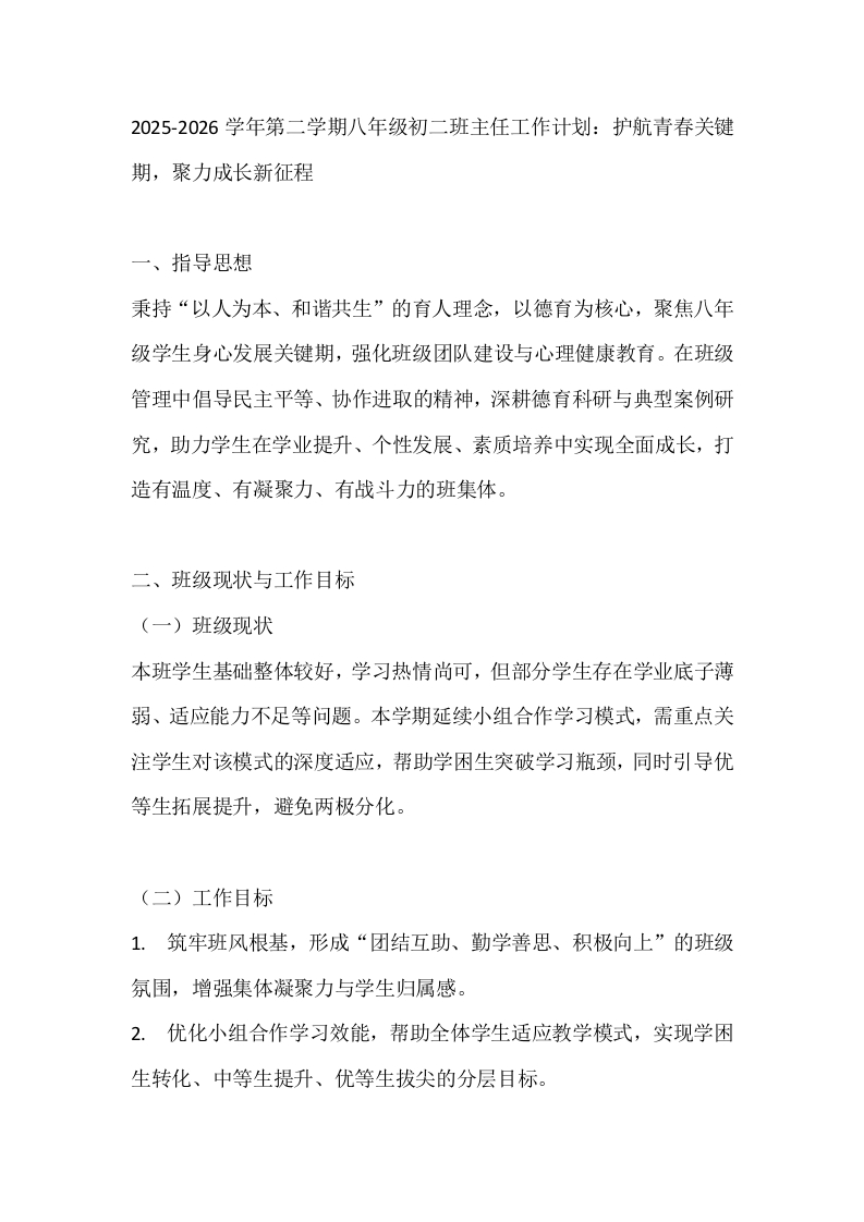 2025-2026学年第二学期八年级初二班主任工作计划:护航青春关键期,聚力成长新征程