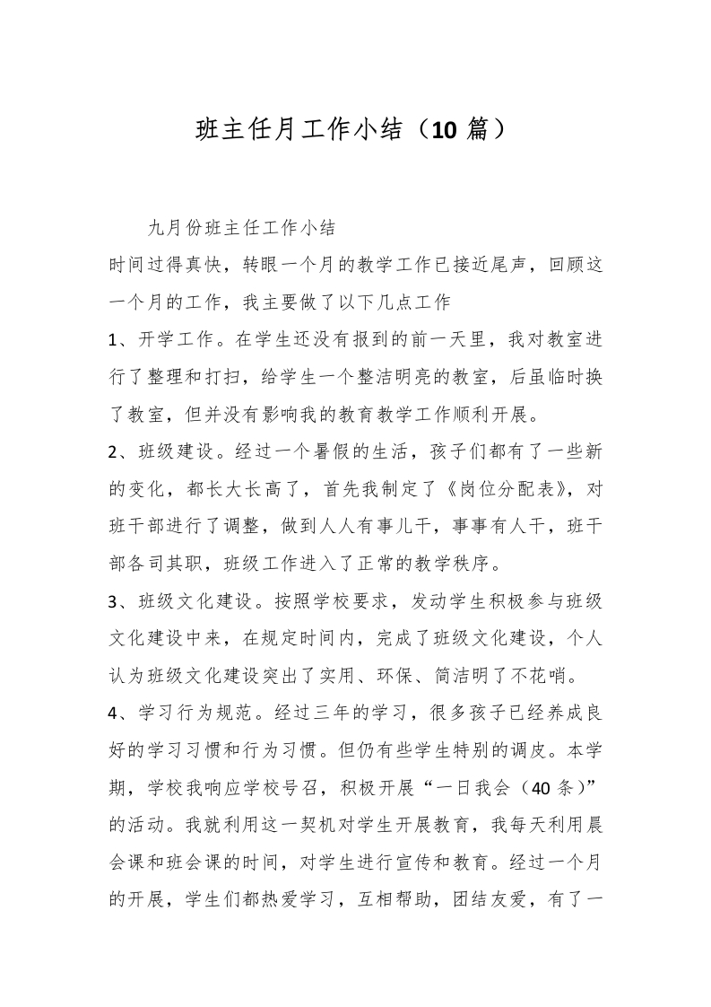(10篇)班主任月工作小结