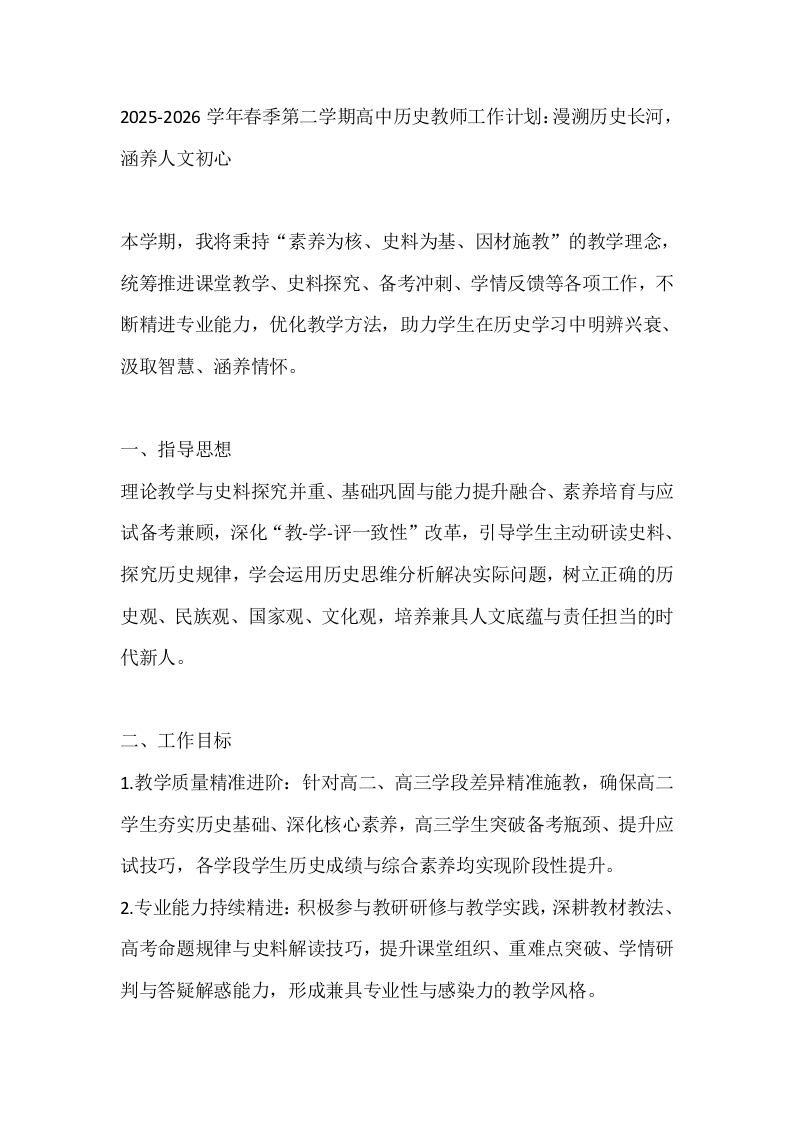 2025-2026学年春季第二学期高中历史教师工作计划:漫溯历史长河,涵养人文初心