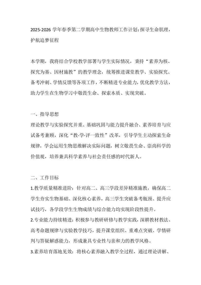 2025-2026学年春季第二学期高中生物教师工作计划:探寻生命肌理,护航追梦征程